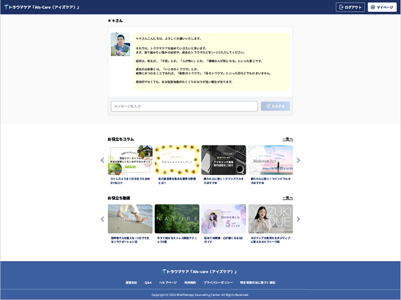 このたび、より多くの方にトラウマケアを提供するために、近年急速に進むAIを活用し、AIカウンセラーによるトラウマケア「AIs-Care」を開発いたしました。