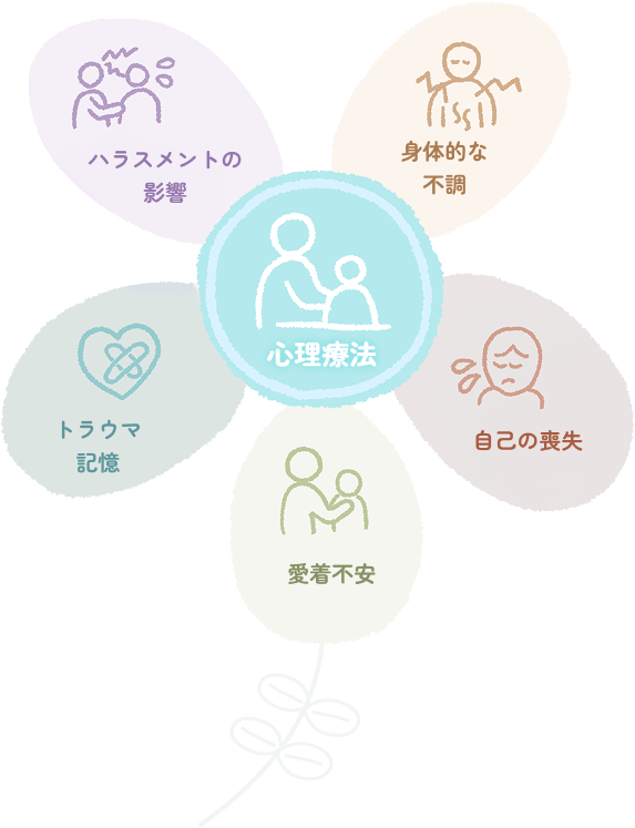 当センターでは、フラッシュバックなどを生じさせるトラウマ記憶、ストレス応答系(自律神経系、免疫系、内分泌系)など身体の失調、自己の喪失、自尊心の低下・自他未分など、愛着不安、愛着障害(安心安全感がない)、ハラスメントの影響などに働きかける独自のトラウマケアを中心としてセッションを行っています。