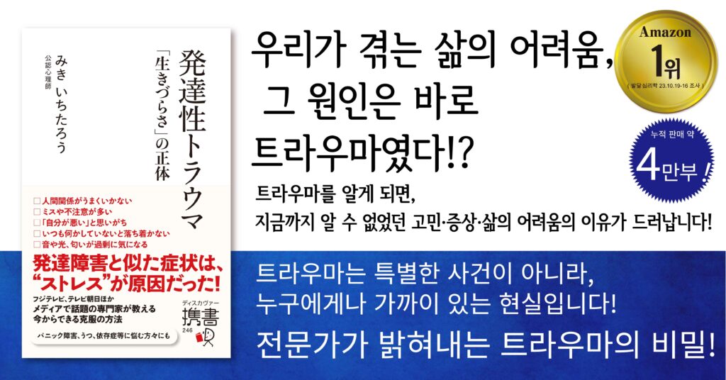 이 글의 필자미키 잇타로(三木 一太朗) 공인 심리사 오사카 대학 졸업, 오사카 대학 대학원 석사 과정 수료 20년 이상 심리 임상 분야에서 활동 중. 다양한 고민, 삶의 어려움의 원인이 되는 트라우마, 애착 장애가 전문. 『발달성 트라우마 「삶의 어려움」의 정체』 등 저서(누계 약 4만 부), TV 프로그램 출연, 드라마 제작 협력·감수, 웹 미디어, 잡지 게재 등 다수. |