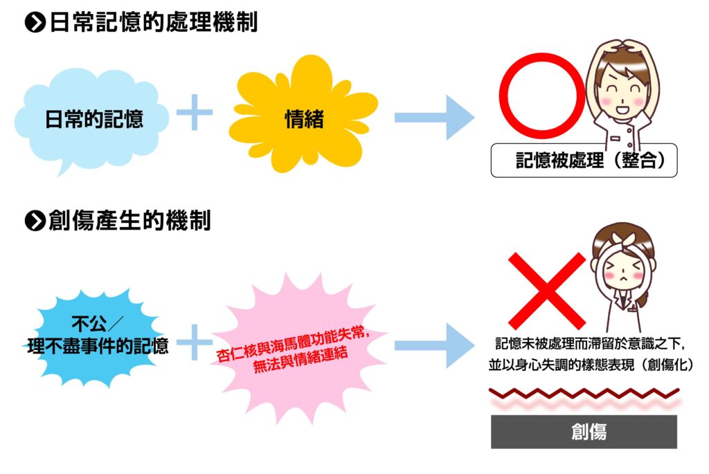 一般記憶會在杏仁核賦予情緒權重,並由海馬進行整理與存放。然而,當事件壓力過於強烈,杏仁核會過度反應,海馬無法處理,記憶因此破碎並殘留於意識之下,被比喻為「冷凍保存的記憶」。